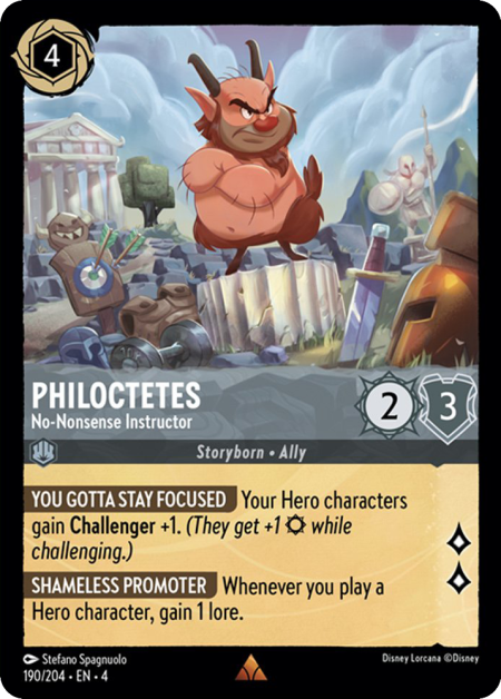 ディシプリン アンド ストレングス(↷),2⬡ – 選んだキャラクターはこのターン、+2☼を得る。このターン、そのキャラクターが他のキャラクターにチャレンジするたび、あなたはカードを1枚引いてもよい。