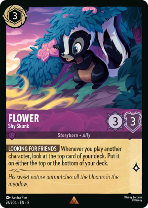 LOOKING FOR FRIENDS あなたが他のキャラクターをプレイするたび、あなたのデッキの一番上のカードを見てもよい。それをデッキの一番上か一番下に置く。