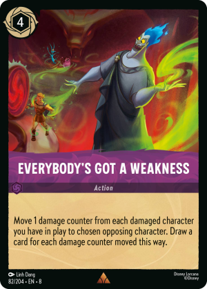 あなたの場にいるダメージを受けている各キャラクターから、ダメージ・カウンター1つを、選んだ対戦相手のキャラクター1体に移動してもよい。この方法で移動させたダメージ・カウンターと同じ数のカードを引く。